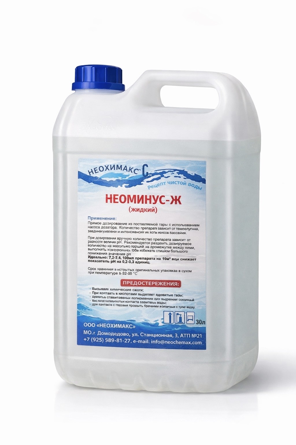 pH минус (Неоминус) — жидкое средство для эффективного снижения уровня pH воды в бассейне. Помогает поддерживать оптимальный баланс (7,2–7,4), улучшает работу дезинфицирующих средств и предотвращает помутнение воды и образование налёта. Подходит для автоматических систем дозирования и ручного применения.